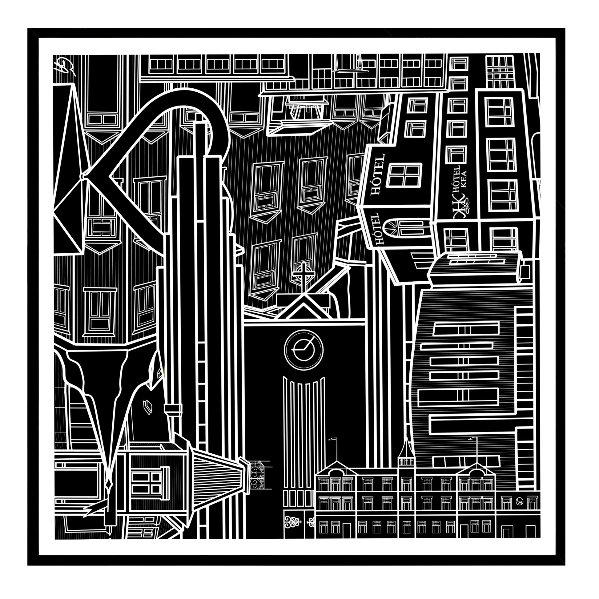 Svarthvítt prentverk með frægum byggingum og kennileitum á Akureyri.